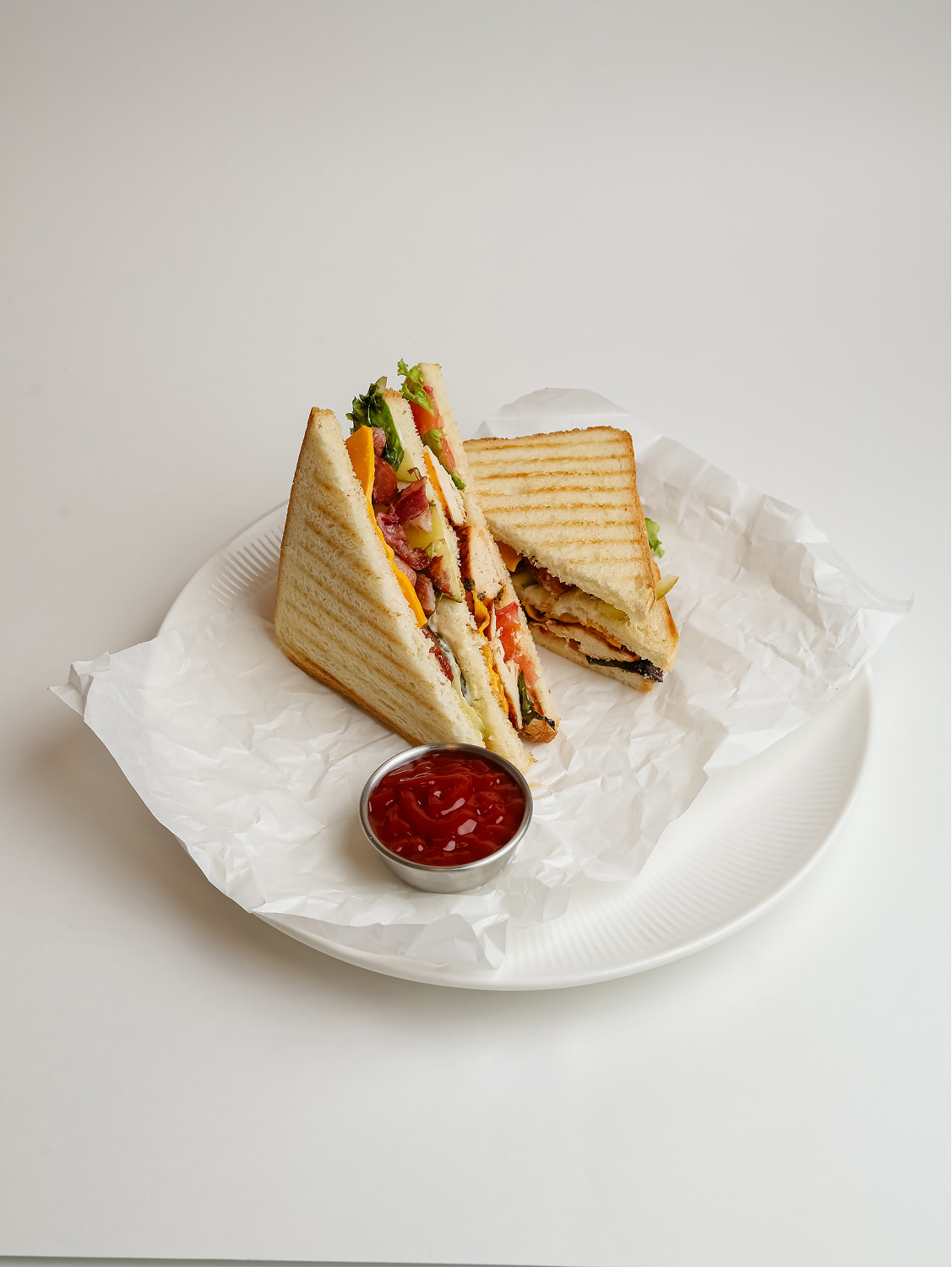Toast bread, bacon, chicken breast, marinated vegetables, tomatoes
