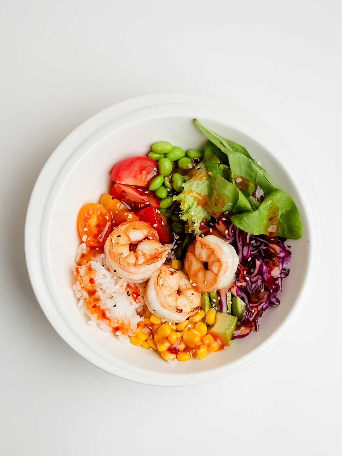 Rice, shrimp, edamame, red cabbage, avocado, mixed greens, corn, cherry tomatoes (served with sweet chili lime sauce)