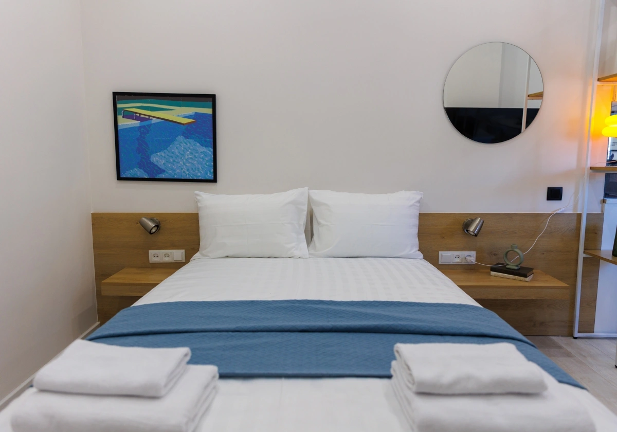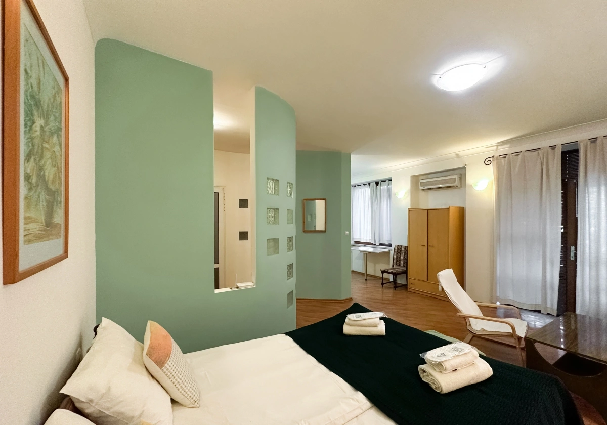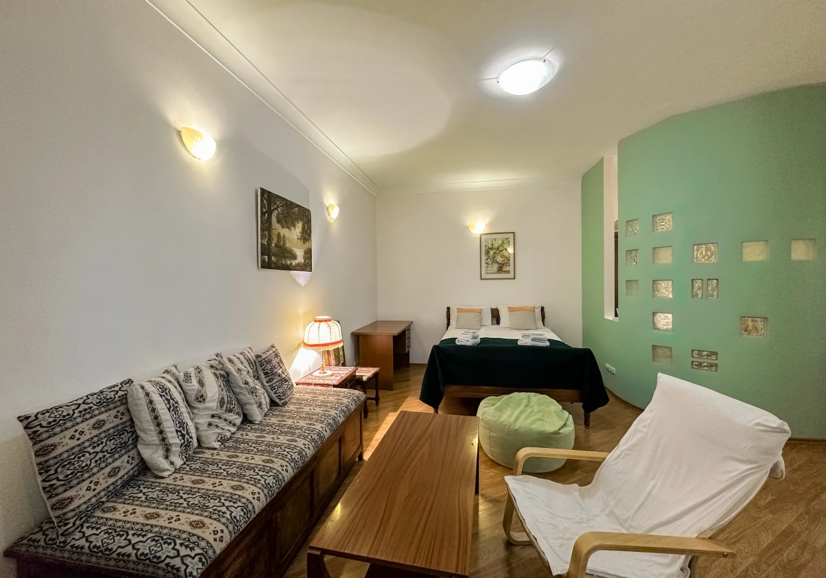 Stylish studio with elevator, featuring a large double bed and sofa bed.